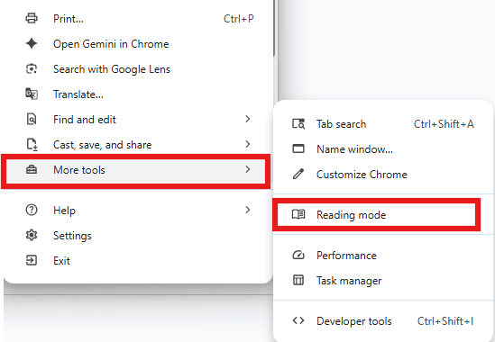 When using the Chrome browser, there are a couple of ways to have the text in CodeSpace read aloud. Click on the three dots in the upper right corner of the Chrome browser. In the drop-down menu, go to “More Tools” and then “Reading Mode.”