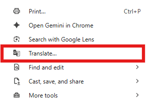 Chrome offers a quick and easy way to translate from English to several languages. Click on the three dots in the upper right corner of the Chrome browser. In the drop-down menu, go to “Translate…”